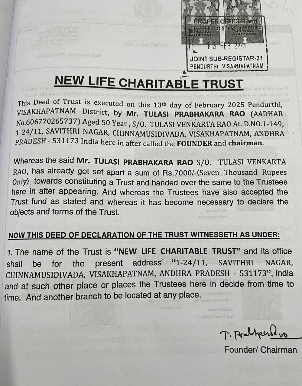 Our organization is led by a visionary leader, Sri. Tulasi Prabhakar Rao, whose unwavering commitment to our cause has been the driving force behind our success. Established in 2025, since then the organization has been expanding continuously in terms of social and Educational Development and Medical services, Food, and Sheltering for Orphans. It has worked for the promotion of sustainable, equitable, and participatory development, social welfare, and social justice through Programs for social work, the Establishment of Educational Technical and Medical Institutes supportive relief and education to the people, Health services, and other human service through social research and dissemination of socially relevant knowledge, social intervention through training and field action, contribution to social and welfare policy and program at State, National and International levels, over the years, The organization has among others (NGOs, Trusts) thrusts made A significant contribution to planning, action strategies, and Human Resource Development in several areas, ranging from sustainable rural and urban development to education, health, Agriculture, and Human Rights, in all case, the focus has been on the disadvantaged and marginalized section of societies, such as women, children and tribal. At NEW LIFE CHARITABLE TRUST , we envision a world where education is a fundamental right for all. Since our inception in [Year], we have been dedicated to breaking down barriers to education, especially for marginalized and disadvantaged communities. Through our school-building initiatives, scholarship programs, and teacher training, we are working towards creating a brighter future for children and youth, empowering them with the knowledge and skills they need to succeed.