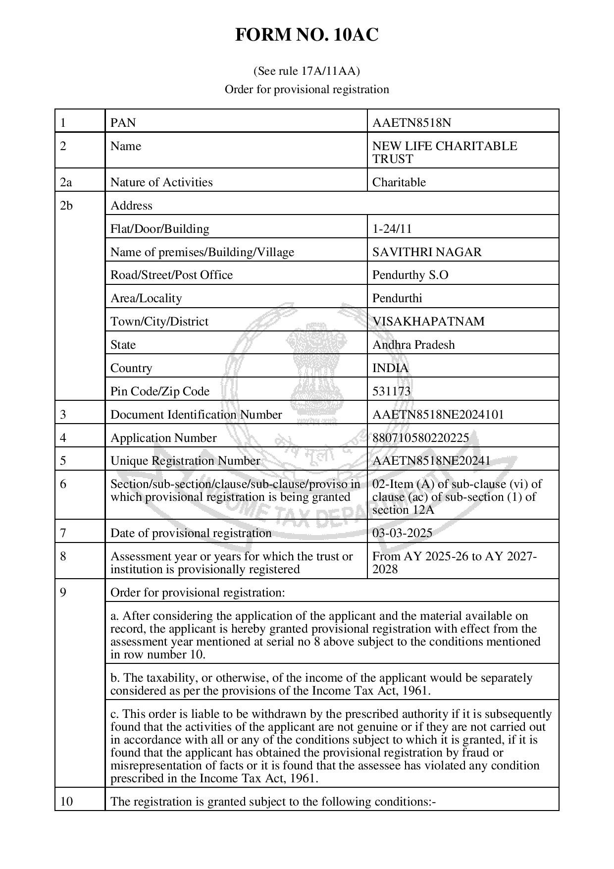 The NEW LIFE CHARITABLE TRUST